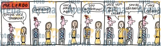 aivari09038 ADÃO ITURRUSGARAI, MUNDO MONSTRO, 3974, VARIEDADES, FOLHA DE SÃO PAULO, 10.09.2009.DiálogoMister Lerdo.- Em que vocÊ trabalha?- Oduvaldo!- Você nasceu aqui?- Sou autônomo!- Você vem muito neste lugar?- Sou de São Paulo!- Você é casado?