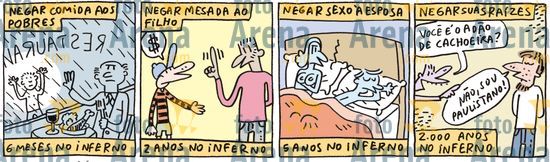 aivari09053 ADÃO ITURRUSGARAI, MUNDO MONSTRO, 4024, VARIEDADES, FOLHA DE SÃO PAULO, 07.11.2009.DiálogoNegar comida aos pobres. 6 meses no inferno.Negar mesada ao filho. 2 anos no inferno.Negar sexo á esposa. 5 anos no inferno.Negar suas raízes. 2.000 anos no inferno.- Você é o Adão de Cachoeira?- Não, sou paulistano!