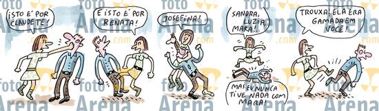 aivari09055 ADÃO ITURRUSGARAI, MUNDO MONSTRO, 4033, VARIEDADES, FOLHA DE SÃO PAULO, 19.11.2009.Diálogo- Isto é por Caudete! E isto é por Renata! Josefina! Sandra, Luzia, Mara! Mara!- Mas eu nunca tive nada com Mara!- Trouxa! Ela era gamada em você!