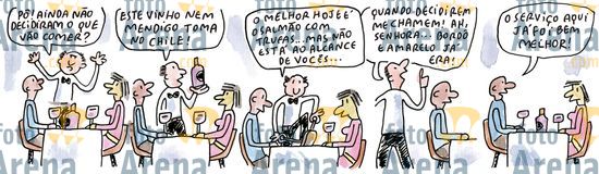 aivari09060 ADÃO ITURRUSGARAI, MUNDO MONSTRO, 4043, VARIEDADES, FOLHA DE SÃO PAULO, 01.12.2009.Diálogo- Pô! Ainda não decidiram o que vão comer? Este vinho nem mendigo toma no Chile! O melhor hoje é o salmão com trufas, mas não está ao alcance de vocês. Quando decidirem me chamem! Ah, senhora... Bordô e amarelo já era.- O serviço aqui já foi bem melhor!