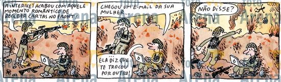 aivari09061 ADÃO ITURRUSGARAI, MUNDO MONSTRO, 4055, VARIEDADES, FOLHA DE SÃO PAULO, 16.12.2009.Diálogo- A internet acabou com aquele momento romântico de receber cartas no front!- Chegou um e-mail da sua mulher... Ela diz que te trocou por outro!- Não disse?