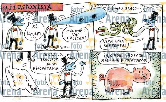 aivari09065 ADÃO ITURRUSGARAI, VARIEDADES, FOLHINHA, 2009.DiálogoO ilusionista.- Se liguem, meu nariz vai crescer! Meu braço vai virar uma serpente! Agora vou levitar! Agora vou me transformar num hipopótamo. Ih, o Adão não sabe desenhar hipopótamo!