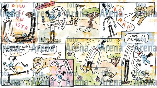 aivari09068 ADÃO ITURRUSGARAI, VARIEDADES, FOLHINHA, 2009.DiálogoO ilusionista.Na África...- Que lugar lindo! Um homem não pode com um leão, a não ser que... Eu amo gatinhos!