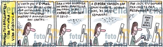 aivrmm3987 ADÃO ITURRUSGARAI, MUNDO MONSTRO, MINHA VIDA RIDÍCULA, FOLHA DE SÃO PAULO, 25.09.2009.DiálogoMomentos brilhantes da minha vida ridícula.É certo que o e-mail facilitou nossas vidas. Por outro lado, essa instantaneidade matou o romantismo das cartas. Era lindo escrever no papel manteiga pautado, ir ao correio, lamber o selo. A espera também era emocionante. Levava dias, ás vezes semanas... Por isso, eu demoro pra cacete pra responder e-mails.Send - 20 dias depois.