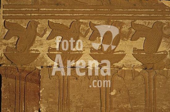 akg999636 Deir el-Hagar (Oase Dachla, Westliche/Libysche Wüste, Ägypten), Tempel der thebanischen Gottheiten Amun, Mut und Chons (römische Zeit, 1.Jahrhundert n.Chr.).-Fries mit Rechitvögeln.-Relief der Sockelzone. Foto, 2006.
