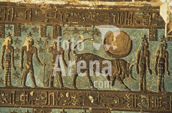 akg896201 Dendera (Ägypten), Hathortempel (ptolemäische Zeit, römische Kaiserzeit, 1.Jahrhundert n.Chr.).-Die Göttin Hathor in Gestalt einer Kuh.-Ausschnitt aus der Decke des Pronaos. Relief, bemalt.