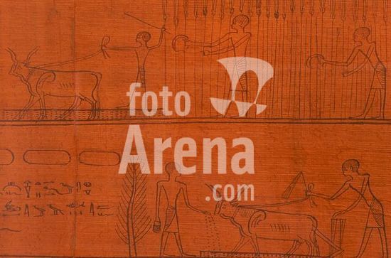 akg810191 El-Kab (Upper Egypt), rock tombs, Tomb of Paheri (New Kingdom, 18th Dynasty, rule of Thutmose III, c. 1450 BC), west wall. /-Harvest, threshing, swingling and registration of the corn; flax harvest; ploughing, hoeing and sowing the field. / Detail of relief depicting the duties of the nomarch Paheri. Relief, painted (graffiti 19th century).