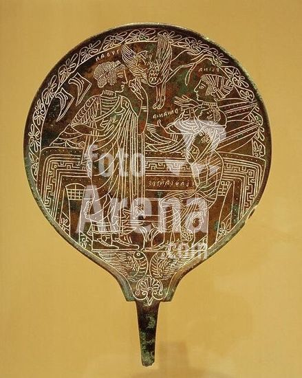 akg969188 Etruskisch, 5. Jahrhundert v.Chr.-Spiegel mit Paris und Helena.-Bronze, H. 22,5 cm, Dm. 16 cm. Herkunft: Praeneste (Palestrina, Latium). Inv.Nr. 16691. Museum: Museo Nazionale di Villa Giulia., Rome.