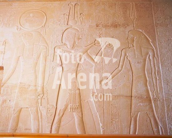 akg895861 Ägyptisch, ptolemäiache u. römische Zeit.-Relief mit Darstellung des Krokodilgottes Sobek und des falkenköpfigen Haroeris links und rechts von zwei Kartuschen.-Kom Ombo, Tempel (Doppelheiligtum des Sobek und des Haroeris).