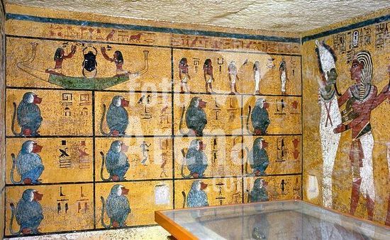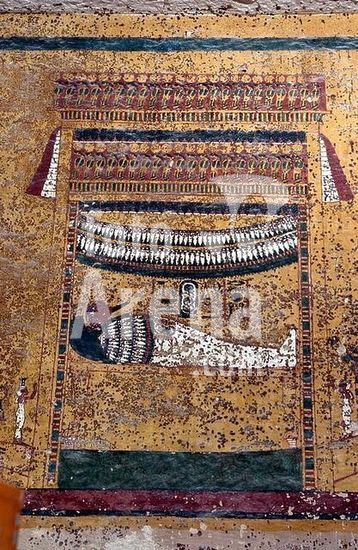 akg811150 Tutankhamun; Egyptian pharaoh, New Kingdom, 18th Dynasty, c. 1346-1337 BC.-Tomb with coffin: view of the west wall with paintings from the Amduat (Ancient Egyptian funerary text). West Thebes, Valley of the Kings, (KV 62). / Photo, 2004.