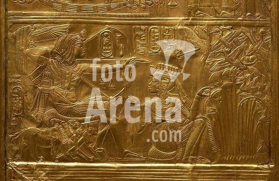 akg942092 Tutankhamen; Egyptian Pharaoh of the 18th dynasty; 1346-1337 BC.-With his wife Ankhesenamen (origin. Ankhesenpaaten).-Detail from the golden statue shrine, back. Wood covered with sheet gold. Dimensions 50.5 x 26.5 x 32cm. From the tomb of Tutankhamen, find no. 108, JE 61481. Museum: Egyptian Museum., KAIRO.