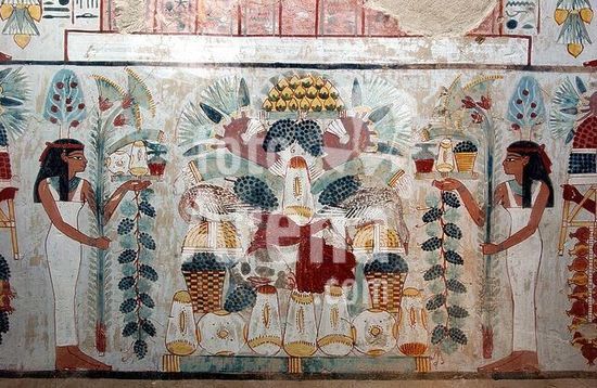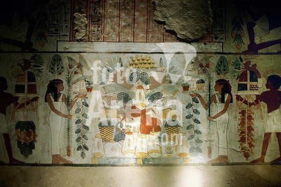 akg585717 Egyptian, New Kingdom, 18th Dynasty, time or Thutmore IV, c. 1390 BC. Fruit and other foodstuffs as tomb offerings. Wall painting in the Tomb of Nakht, scrine amd priest under Thutmose IV. Luxor Thebes, tombs of Sheikh Abd al-Qurnah, TT 52.
