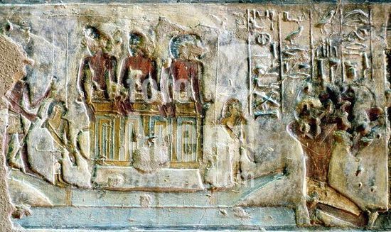 akg810132 El Kab (Upper Egypt), rock tombs, Tomb of Paheri (New Kingdom, 18th Dynasty, rule of Thutmose III, c. 1450 BC), west wall, northern stretch.-Funeral rites (detail): barque with coffin; Paheri kneeling in adoration.-Relief, painted.