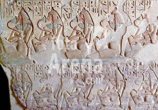 akg867219 Egyptian, New Kingdom, 18th dynasty, c.1370 BC.-Banquet scene, detail.-Basrelief from the tomb of Ramose, vizier under Amenhotep III and Akhenaton (Amenhotep IV), Dayr al-Madinah, Thebes West, tomb of Ramose (TT 55).
