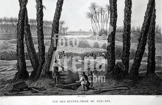 akg810064 Giseh (Ägypten), Pyramiden, (4.Dynastie, 3.Jahrtausend v.Chr.).-"Memphis / Vue des ruines, prise du Sud-Est" (Blick von Südosten über den Nil auf die Pyramiden; im Vordergrund Vermessung einer kolossalen Hand).-Kupferst. von Delignon nach A. Dutertre. Aus: Description de L'Égypte, Paris 1809 ff., A Bd.4, Tf.3. Ausschnitt. Museum: Private Collection., KAIRO.