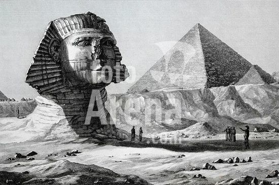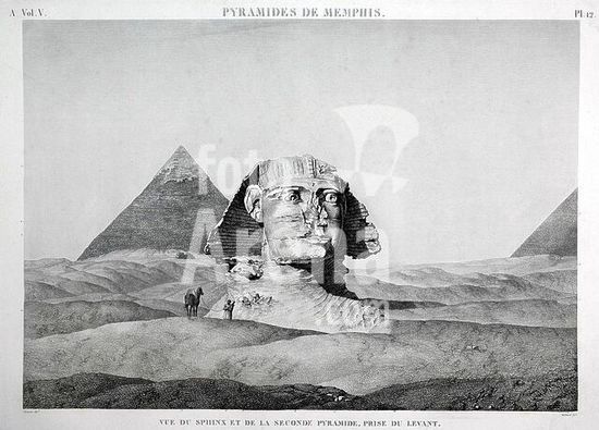 akg810076 Giseh / Giza (Ägypten), Große Sphinx (Altes Reich, 4.Dynastie, um 2590 v.Chr). /-"Pyramides de Memphis / Vue du Sphinx (..) prise du Levant" (Ansicht der Sphinx von Osten; im Hintergrund die Chefrenpyramide).-/ Kupferst. von Baltard nach André Dutertre (1753-1842). Aus: Description de L'Égypte, Paris 1809 ff., A Bd.5, Tf.12 (Ausschnitt).