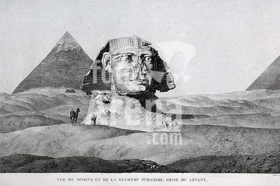 akg810072 Giseh / Giza (Ägypten), Große Sphinx (Altes Reich, 4.Dynastie, um 2590 v.Chr). /-"Pyramides de Memphis / Vue du Sphinx (..) prise du Levant" (Ansicht der Sphinx von Osten; im Hintergrund die Chefrenpyramide).-/ Kupferst. von Baltard nach André Dutertre (1753-1842). Aus: Description de L'Égypte, Paris 1809 ff., A Bd.5, Tf.12 (Ausschnitt). Museum: Private Collection., KAIRO.