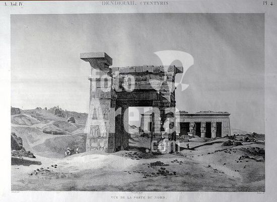akg810151 Dendera (Ägypten), Hathortempel (ptolem. Zeit). /-"Dendera (Tentyris) / Vue de la Porte du Nord" (Ansicht mit Nordtor).-/ Kupferst. von Lorieux nach André Dutertre (1753-1842). Aus: Description de l'Égypte, Paris 1809 ff., A. Bd. VI, Tf.4. Museum: Private Collection., KAIRO.