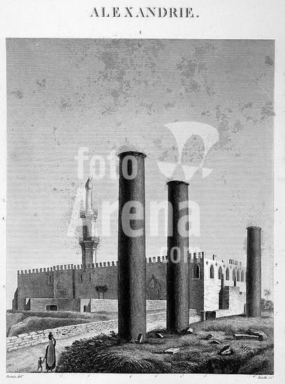 akg967050 Alexandria / El-Iskandarîya (Unter-ägypten), Säulenstraße. /-"Vue des trois colonnes en granit, situées au sud de l'ancienne basilique vulgairement nommée mosquée de St.Athanase".-Kupferstich von Jean-Baptiste Réville nach Zeichnung Jean Constantin Protain (1769-1837). Aus: Description de l'Égypte, Paris 1809 ff., A.Bd.V, Tf.35. Museum: Private Collection., KAIRO.