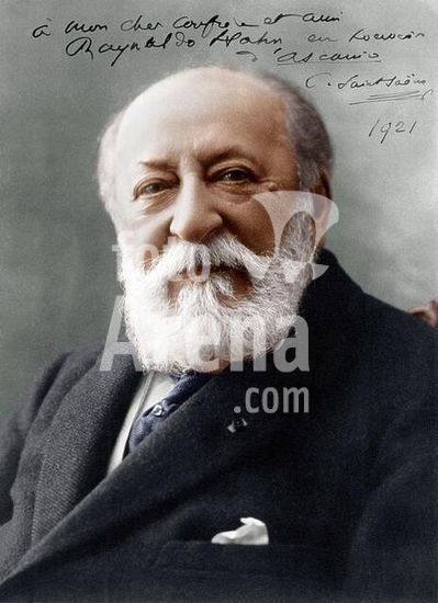 akg895395 Saint-Saëns, Camille French composer, Paris (France) 9.10.1835-Algiers (Algeria) 16.2.1921. Portrait photograph, 1921, Tunis, with handwritten dedication to the composer Reynaldo Hahn; digitally coloured.