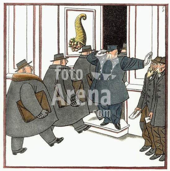akg869392 Finanzwesen: Bank.-"Großbanken. / Die Herren Kleinspekulanten bitte durch den Eingang für Dienstboten!"-Karikatur von E. Schilling. Aus: Simplicissimus, 1922/23. Spätere Kolorierung.