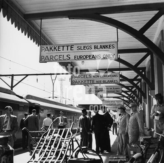 akg974137 Nelspruit (Provinz Mpumalanga, Republik Südafrika), Bahnhof.-Bahnsteig mit Beschilderung der Rassentrennung.-Foto, 1965.