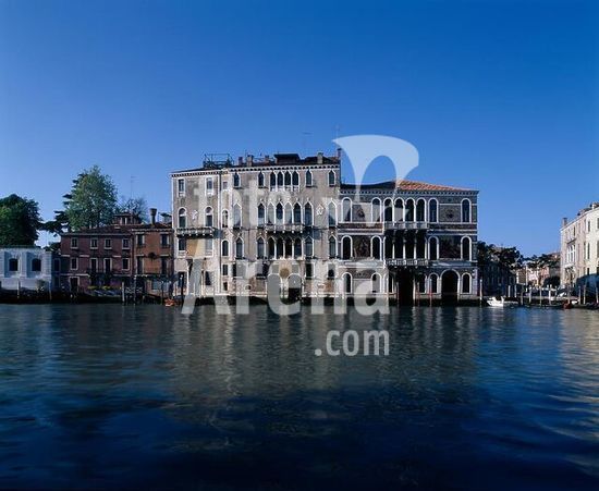 akg816403 Venice (Veneto, Italy), Canal Grande, right bank, Palazzo da Mula (end of 15th century).-Palazzo da Mula (centre), to the left: Palazzo Centanni (18th century), to the right: Palazzo Barbarigo (end of 19th century with mosaics by Giulio Carlini).-/ Photo, undated.