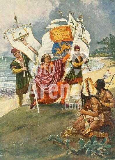 akg018981 Columbus, Christopher; navigator, discoverer of America, 1451-1506. "Columbus' Arrival in America". (On 12.10.1492 Columbus sets foot on the Bahama Island Guanahani). Watercolour, 1905, by Eugen Hanetzog. (born 1860). From: M.Reymond, Panorama der Weltgeschichte, Berlin (U.Meyer) undated.
