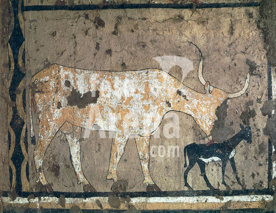 akg1349995 Ägyptisch, Erste Zwischenzeit / Mittleres Reich, 11. Dynastie, um 2200 v. Chr. Kuh mit neugeborenem Kalb. Wandmalerei. Aus dem Grab des Iti. Nekropole von Gebelein (Oberägypten). Foto, undatiert. Turin, Museo Egizio. Museum: Turin, Museo Egizio. Author: ANDRE HELD.