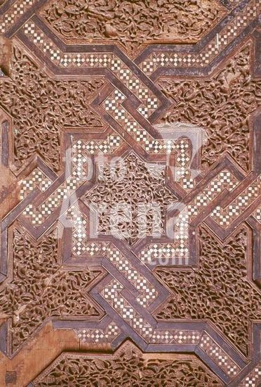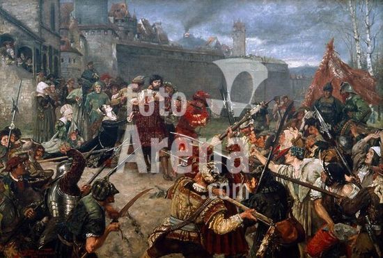 Mantua-Mantova (Lombardy, Italy), Palazzo Ducale, Castello S.Giorgio, Camera degli Sposi (frescos, c.1465-74, by Andrea Mantegna; 1431-1506).-Interior view looking northwest: west wall with "Meeting between Ludovico III Gonazaga and his son Francesco", north wall with "Court of Ludovico III".-Photo.