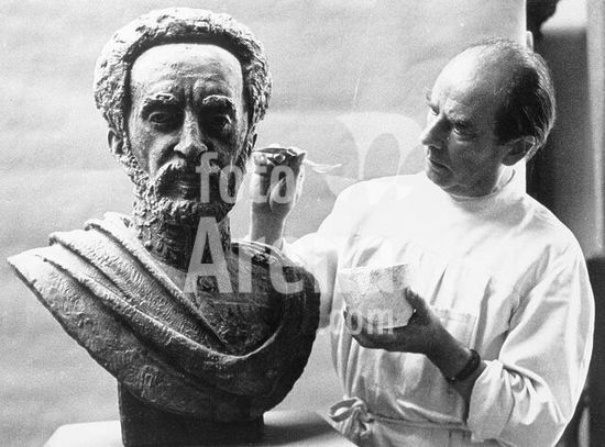 akg163770 Breker, Arno; sculptor; Elberfeld 19.7.1900 - Düsseldorf 13.2.1991. Arno Breker sculpting his bust of the Ethiopian emperor Haile Selassi (upon request of the emperor himself, to be exhibited at the emperial palace in Addis Ababa). Photo, 10th October 1955. Copyright: This artwork is not in the public domain. It is your responsibility to obtain all necessary third party permissions from the copyright handler in your country prior to publication. © Arno Breker.