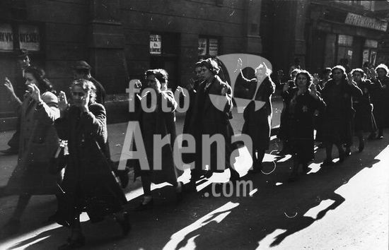akg185576 The Holocaust. World War II / Deportation of Hungarian Jews, summer 1944, after the invasion of Hungary by German troops and units of the Waffen-SS, on 19th March 1944. Budapest: Jewish women are led through the streets with hands raised above their heads. Photo, summer 1944.