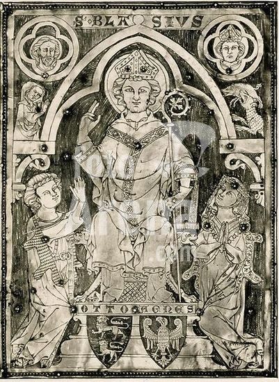 akg221222 Lower Saxon, Braunschweig, 1339. Otto the Benevolent and his wife Agnes before the Holy Bishop Blaise. Front cover of the plenarmissal of Otto the Benevolent. Silver sheet, engraved and chased. From the Treasury of the Guelfs, former Braunschweig, St. Blasius Church. Berlin, SMB, Kunstgewerbemuseum. Museum: Berlin, SMB, Kunstgewerbemuseum.