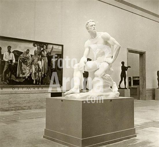 akg222959 Ausstellungen: Kunstausstellungen. Große Deutsche Kunstausstellung, München 1941: Skulptur "Berufung", 1940-41, von Arno Breker (1900-1991) im Vordergrund). Foto (Teil einer stereoskop. Aufnahme), H. Schoepf. Aus: Kurt L. Tank, "Deutsche Plastik unserer Zeit", (Raumbildverlag O.Schönstein), München, o. J., Bild-Nr. 129. Berlin, Sammlung Archiv für Kunst und Geschichte. Museum: Berlin, Sammlung Archiv für Kunst und Geschichte. Copyright: © Arno Breker. This artwork is not in the public domain. It is your responsibility to obtain all necessary third party permissions from the copyright handler in your country prior to publication.