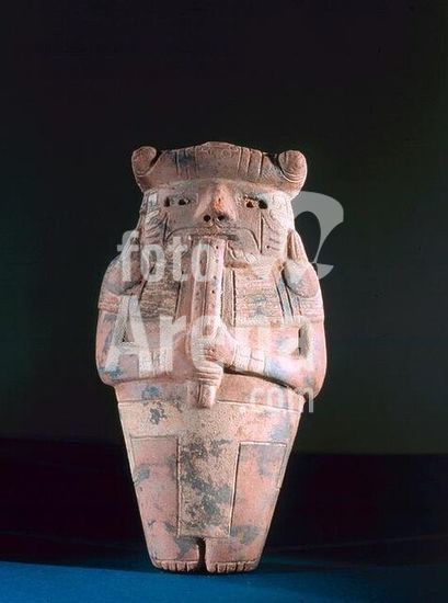 akg270294 Peruanisch, früher Horizont, Nordküste, Chavin-Kultur, Tembladera, um 600-400 v. Chr. Flötenspieler mit Jaguar-Kopfputz; die Gesichtstätowierung deutet auf einen Schamanen. Keramik, Höhe 19,7 cm. New York, David Bernstein Collection.