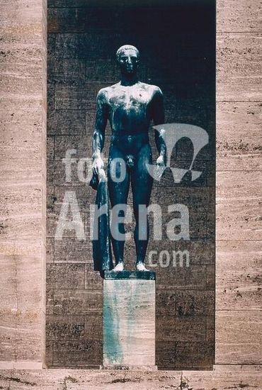 akg280791 Berlin-Charlottenburg, Olympiagelände, Haus des Deutschen Sports, Skulpturen in den Kolonnaden. "Zehnkämpfer". Skulptur, 1937, von Arno Breker (1900-1991). Foto, Sommer 1998. Copyright: © Arno Breker. This artwork is not in the public domain. It is your responsibility to obtain all necessary third party permissions from the copyright handler in your country prior to publication.
