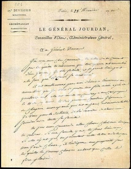 akg321251 Jourdan, Jean Baptiste, Comte Marshal of France Limoges 29.4.1762 - Paris 23.11.1833. - Letter from General Jourdan to General Alexandre Rétore-Dumas-Davy de la Pailleterie, dated 16.8.1802, in which he congratulates him on the birth of his son Alexandre (Alexandre Dumas père, 1802-1870). 19.5 × 25cm. Societé des Amis d'Alexandre Dumas. Museum: Societé des Amis d'Alexandre Dumas.