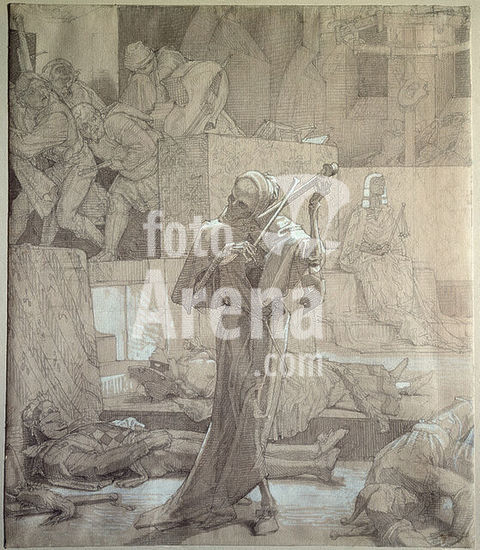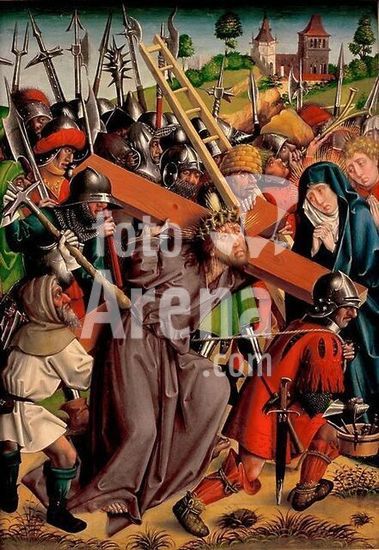 Master of the Karlsruh Passion (Hans Hirz?); active in Strasbourg, late. 15th Century. "Christ Carrying the Cross", c. 1450/55. One of seven images from an altarpiece depicting scenes from the Passion of Christ. Mixed media on wood, 66,5 × 46,4 cm. Karlsruhe, Staatliche Kunsthalle. Museum: Karlsruhe, Staatliche Kunsthalle. Copyright: gesperrt AKG1103161 ist besser.