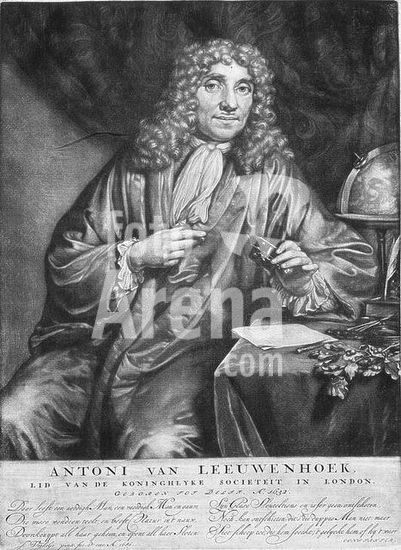 akg332146 Leeuwenhoek, Antoni van; Dutch scientist. (discovered Infusoria, Bacteria etc using microscope developed himself). Delft 24.10.1632 - 27.8.1723. Portrait. Mezzotint, 1686, by Jan I Verkolje. (1650-1693) after painting by the same artist. Paris, Bibliothèque Nationale. Museum: Paris, Bibliothèque Nationale.