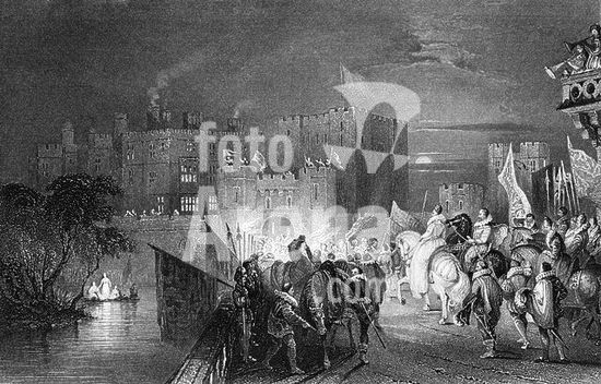 akg383278 Scott, Walter; schott. Dichter; 1771-1832. Werke: Kenilworth (Roman, 1821). "Kenilworth Castle" (Einzug der Königin Elisabeth I. in Kenilworth Castle). Stahlstich, 1838, von W.Floyd nach Zeichnung von Thomas Allom (1804-1872). Paris, Bibliothèque Nationale. Museum: Paris, Bibliothèque Nationale.