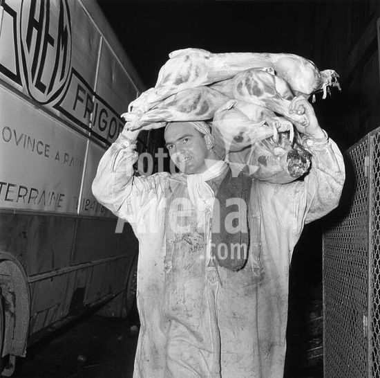 akg415780 Paris, France. Les Halles (covered market in the centre of Paris, built 1852-59, architect: Victor Baltard, pulled down in 1972). Man carrying meat. Photo, undated, c.1950.
