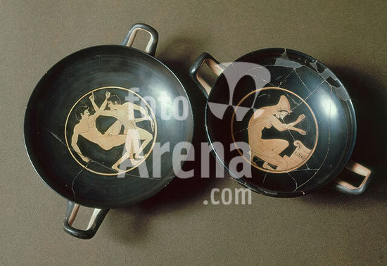 akg4539302 Griechische Vasenmalerei, attisch, rotfigurig, archaisch, links Epiktetos, um 520, rechts Chairias-Maler,um 510/500 v. Chr. - Zwei Kylikes. Links Faustkämpfer, rechts kniende Frau an einem Altar. - Ton, gebrannt. Fundort: Agora, Athen. Athen, Agora-Museum. Museum: Berlin, Sammlung Archiv für Kunst und Geschichte.