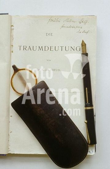 akg465616 Sigmund Freud (Sigismund Schlomo Freud). 1856-1939; Austrian neurologist and founder of the discipline of psychoanalysis. Sigmund Freud's glasses and pen on the open book "The Interpretation of Dreams" (1900) with dedication to Helene Schiff. Photo, undated. Wien, Sigmund Freud Museum Wien. Museum: Wien, Sigmund Freud Museum Wien.