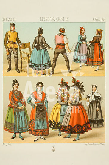 akg5858081 Folklore / Spain. - "ESPAGNE / Costumes populaires, Vieille Castille, Royaume de Leon" (Spain, national costumes, Old Castile and Kingdom of León). - (Upper row from left: Mayor of Segovia province. The ceremonial costume of Santa Maria de Nueva, province of Segovia. Plowing peasant of the province of Segovia. Two women from Santander, province of Burgos. Bbottom left from left: Woman's costume in Santa Maria de Nueva, Province of Segovia. Charra, rich peasant woman from the province of Salamanca. Two peasant women from the province of Avila. Citizen woman of the province of Asturias). Color lithograph by Percy after photographic shots. Print: Firmin-Didot et Cie., Paris. From: A. Racinet (Auguste Racinet, 1825-1893), Le Costume Historique, Cinq cents planches (...), Types principaux du vêtement et de la parure rapprochés de ceux de l 'intérieur de l'habitation dans tous les temps et chez tous les peuples, avec de nombreux détails sur le mobilier, les armes, les objets usuels, les moyens de transport, etc., Paris (Librairie Firmin-Didot et Cie.) 1888, Volume VI, Plate 472. Private collection.