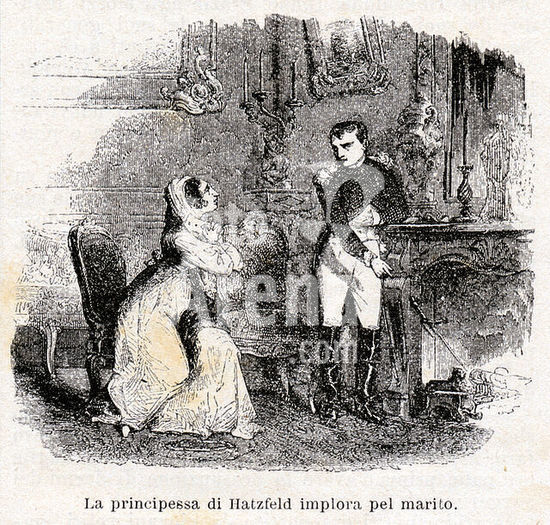 akg5887149 Napoleone BONAPARTE (15 August 1769 - 5 May 1821) entered victorious in Berlin after the battle of Jena (1806), urged by the consuming request of the princess consort, desperate for her husband and for the offspring that carried in her belly, destroys the fire compromising letter addressed to the King of Prussia, for which Prince Franz Ludwig of Hatzfeld (1756 - 1827) would be convicted on charges of high treason. Engraved by Antonio Bonamore (1845-1907), from "Storia di Napoleone" by Jacques De Norvins (18 June 1769 - 30 July 1854), Edoardo Sonzogno publisher, Milan 1893.