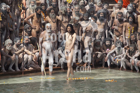 akg6377410 Naga sadhus on Har-ki-Pauri ghat about to take a dip in the river Ganges on the occasion of ""Somvati Amavasya"", a no moon day in the traditional Hindu calendar.During the Maha Kumbh Mela festival, the 'Shahi Snan' (royal bath) is considered a highly auspicious bathing day.According to Hindu mythology 4 drops of Amrit, the elixir of immortality, accidentally spilled over from a pitcher while being carried by the celestial bird Garuda. The kumbh mela takes place every 12 years in the 4 cities where the amrit fell. Haridwar, India.