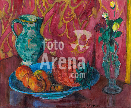 akg8189849 Purrmann, Hans1880 Speyer - 1966 BaselBowl of Fruits with Pineapple and Jug. 1950. Oil on canvas. 60 x 73cm. Signed lower right: H. Purrmann. Inscribed verso on the stretcher: 1948 Montagnola. Craftman's frame. Provenance:- Galerie Prestel, Frankfurt/Main (1962) - Private collection- Neumeister, Munich (1984) - Galerie Heseler, Munich (1985) - Friedrich Wilhelm Waffenschmidt Collection, Cologne Exhibitions:- Galerie Rudolf Levy, Frankfurt/Main 1962 Literature: - Lenz, Christian/Billeter, Felix: Hans Purrmann - Die Gemälde II, 1935-1966, Werkverzeichnis, Munich 2004, cat. rais. no. 1950/33, colour ill. (here noted: archive no. 612, location unknown). Informations Collection Waffenschmidt. Art trade, Van Ham. Copyright: © Hans Purrmann. This artwork is not in the public domain. Additional copyright clearance may be required before use of this image.