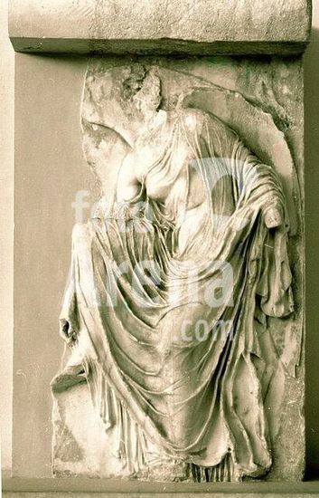 akg863156 Relief of Nike fastening her sandal from the balustrade of the temple of Athena Nike . Country of Origin: Greece. Culture: Ancient Greek. Date/Period: c. 410 BC. Place of Origin: Acropolis, Athens. Material Size: marble.