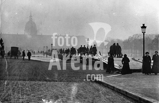 akg022463 Architecture:. Bridges / Ponton. Flood on the Esplanade des Invalides in Paris: Ponton built by a soldier. Photo, c. 1900.
