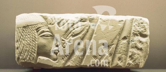 akg082752 Akhenaton (Amenhotep IV), Egyptian Pharaoh, 1364 - 1347 BC. - Akhenaton under the rays of the sun. Sandstone, 23 × 52cm. Finding place: Karnak. Luxor, Museum. Museum: Luxor, Museum.
